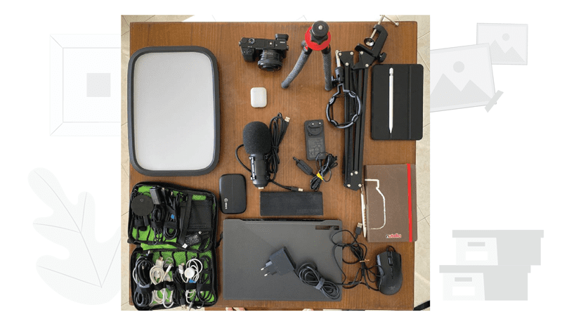I’ll share with you my travel setup that I just took a picture of: