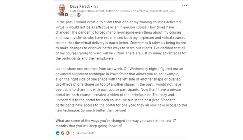 Some say they shouldn’t be recorded so as not to give an extra excuse to get distracted, and some are in favor. Just recently, a fellow PowerPoint expert was explaining that by uploading his latest findings to a training portal that is also dedicated to former trainees, he has a way to keep generating value for them precisely because of these recordings.