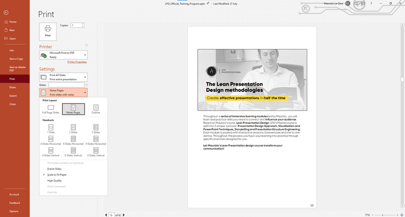 It’s very simple but really useful when you’re short on time and need to create a presentation that you can both present and share. All you have to do is write in the PowerPoint notes and then print in A4 format with the notes on the page.
