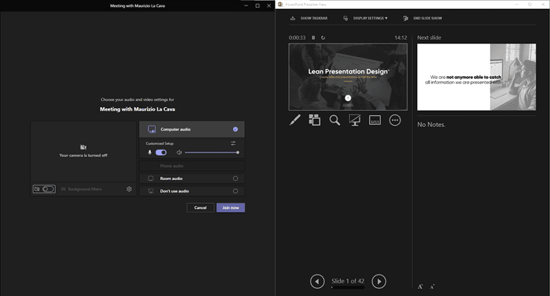 In fact, you’ll need to have an eye both on the conference room – the only point of contact with your virtual audience – and on PowerPoint’s presenter mode in order to anticipate the commentary on the next slide.