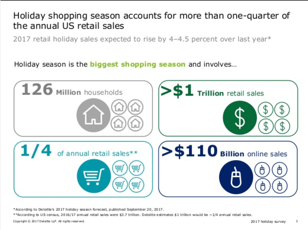 Guardando alla slide di Deloitte è chiaro che il presentatore voglia comunicare l’importanza della stagione di vacanze per lo shopping. Vengono inoltre presentate delle informazioni a supporto di questa affermazione.